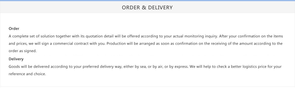 A complete set of solution together with its quotation detail will be offered according to your actual monitoring inquiry. After your confirmation on the items and prices, we will sign a commercial contract with you. Production will be arranged as soon as confirmation on the receiving of the amount according to the order as signed.