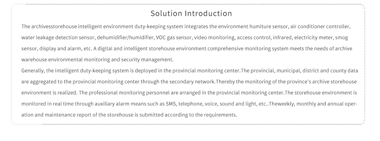 The archivesstorehouse intelligent environment duty-keeping system integrates the environment humiture sensor, air conditioner controller, water leakage detection sensor, dehumidifier/humidifier, VOC gas sensor, video monitoring, access control, infrared, electricity meter, smog sensor, display and alarm, etc. A digital and intelligent storehouse environment comprehensive monitoring system meets the needs of archive warehouse environmental monitoring and security management.
