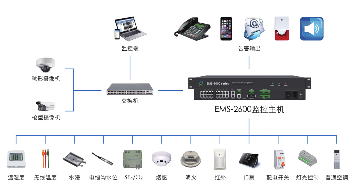 The power distribution network environment monitoring solution, which is introduced by Sunwe for the power industry, consists of EMVIEW network monitoring platform, EMS series environment monitoring host and sensors. The data application , data acquisition and data sensing are formed by this. It is a three- structure of the Internet of Things. The solution has a very remarkable characteristic of stability, security and ease of use.