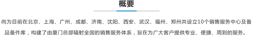 尚為目前在北京、上海、廣州、成都、濟南、沈陽、西安、武漢、福州、鄭州共設立10個銷售服務中心及備品備件庫,構建了由廈門總部輻射全國的銷售服務體系,旨在為廣大客戶提供專業、便捷、周到的服務。