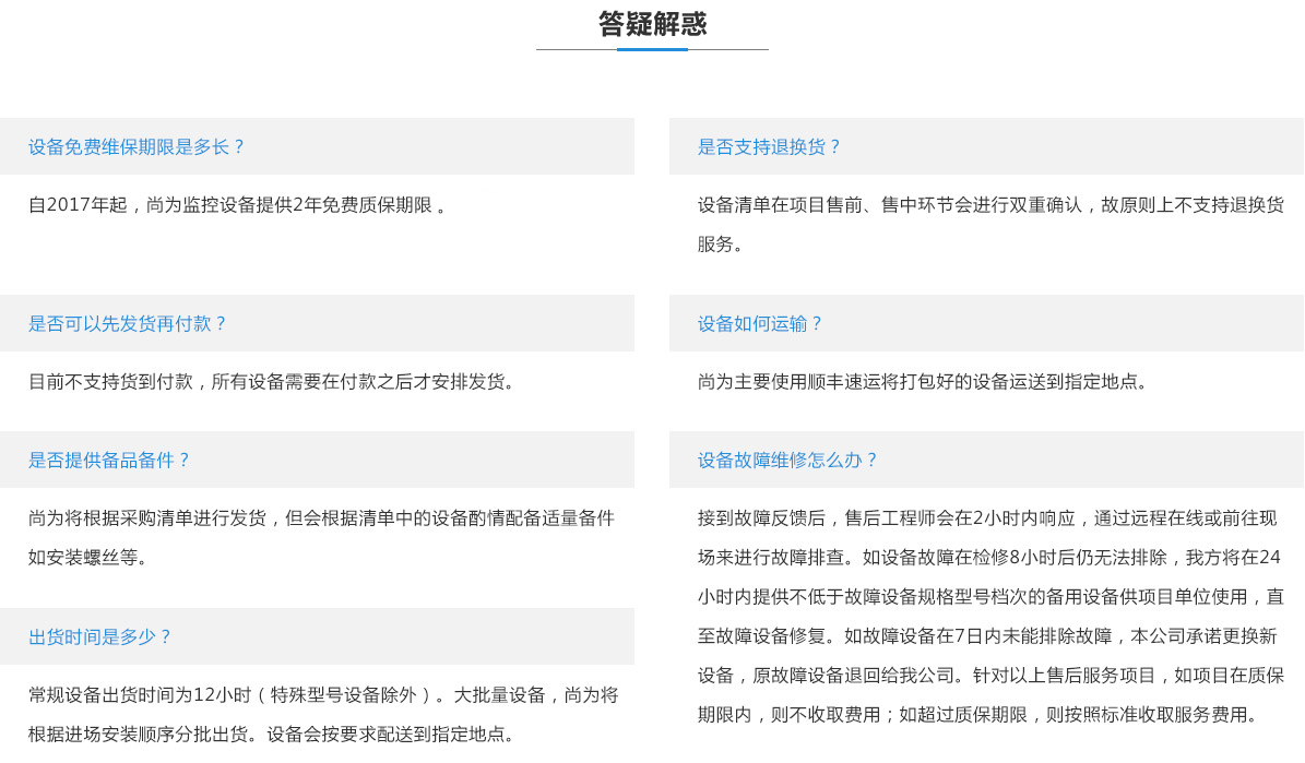 設備清單在項目售前、售中環節會進行雙重確認,故原則上不支持退換貨服務。